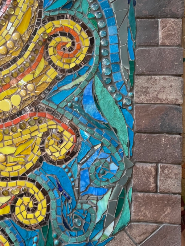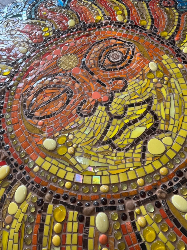 The Sun is shown with radiant curling rays, its face reimagined with a playful wink, a touch requested by the commissioners and interpreted through Carolyn’s hand. This detail gives the mosaic extra character and warmth, inviting a joie de vivre into the life of the young family who now live with it daily. With shifting light, the work reveals changing moods - bright at noon, glowing at dusk, playful and knowing, anchoring itself as both art object and lived presence.