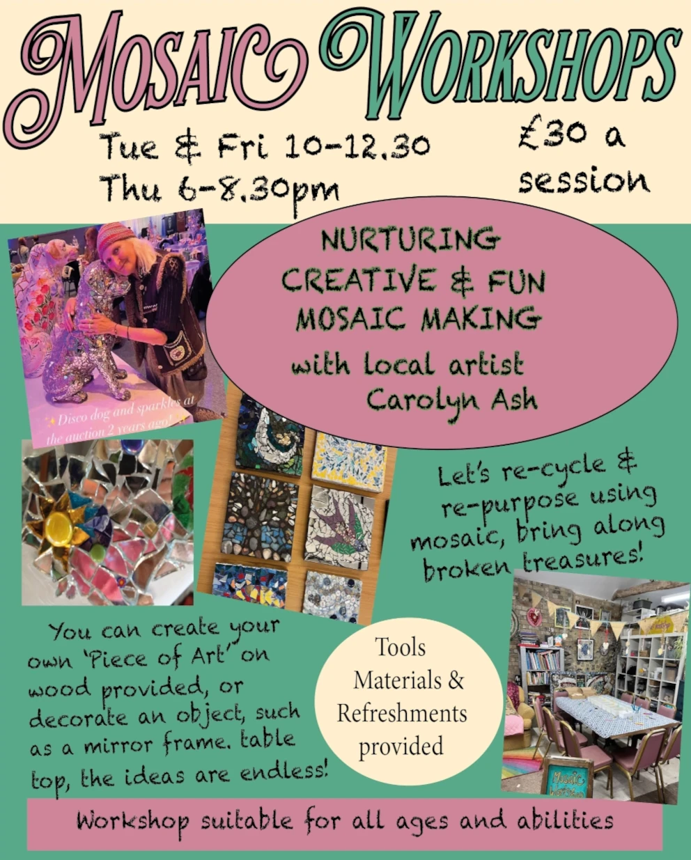 Book your place for Tuesday and/or Friday mornings, and Thursday evenings. Bring your own project or start something new — with Carolyn’s guidance and a table full of materials.